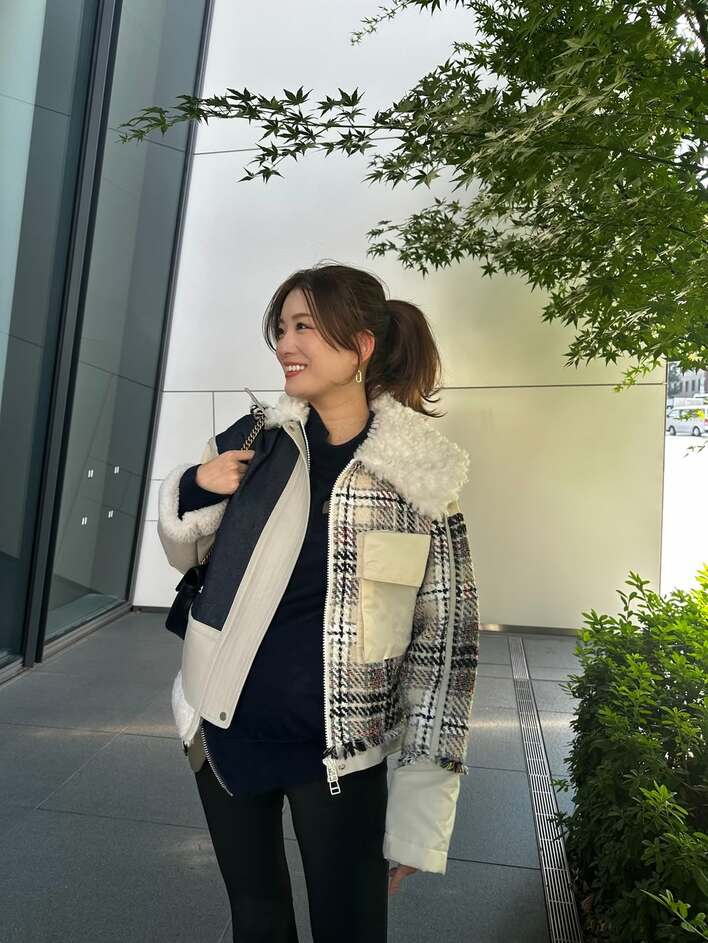 公開された写真には、襟がもこもこのボアになった白のチェックのアウターに、黒のパンツを合わせたコーディネートで、笑顔を浮かべながらたたずむ蜂谷さんの姿が!