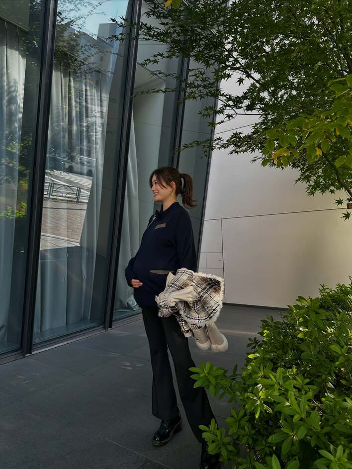 第2子妊娠中で臨月を迎え、おなかがふっくらしているのが分かるお出かけコーデを披露しました。