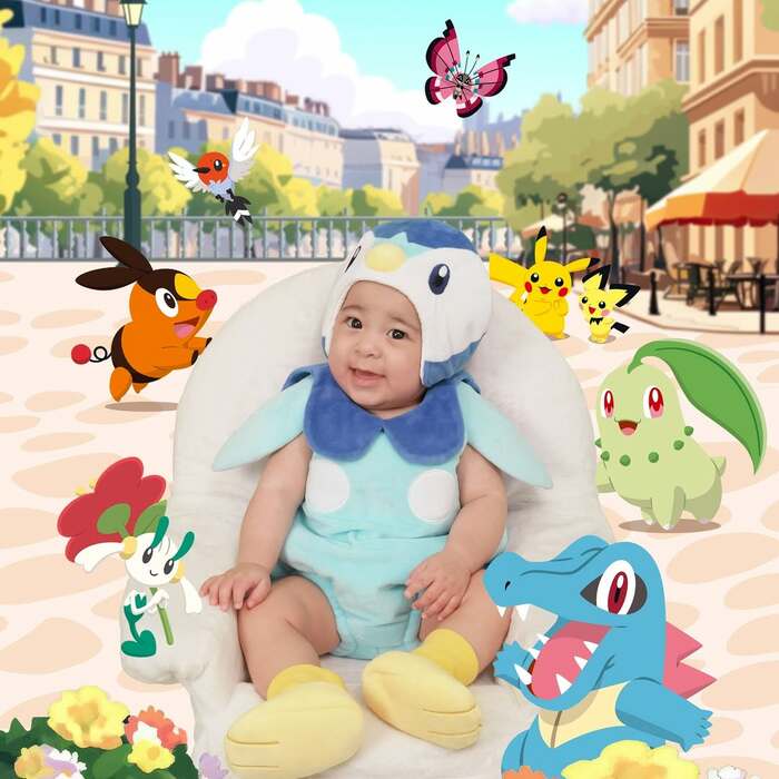 2人のあどけないほほ笑みに目を引かれます。後ろには、チコリータやポカブ、ワニノコなどのポケモンも一緒にうつっていて、癒やし満載のショットに仕上がっていますね。
