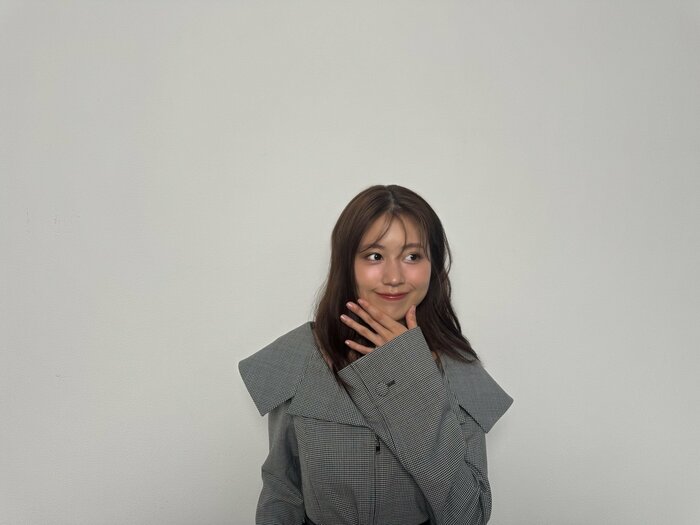 緩く巻いたミディアムヘアを下ろし、顎に手を当てています。