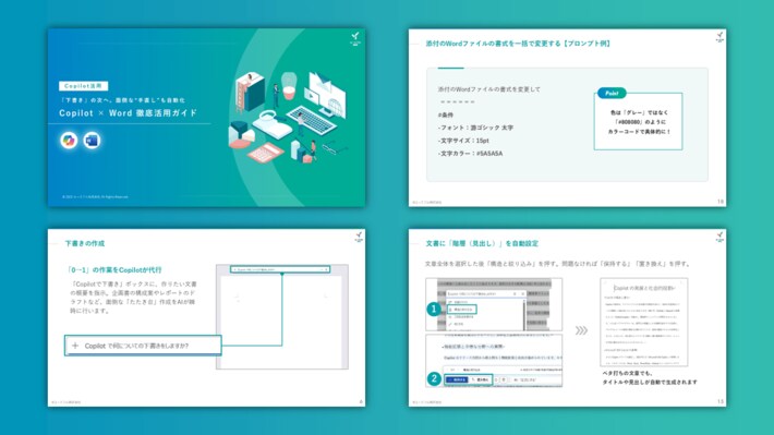 この度、無料配布を開始した「Copilot × Word 徹底活用ガイド」は、Copilotを活用して文書作成の3ステップ(下書き・編集・仕上げ)を自動化・効率化する方法を、図解で分かりやすく解説しています。本ガイドを社内研修やマニュアルとして活用いただくことで、組織全体のWordスキルを底上げすることが可能です。