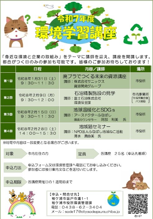 市では、市民の皆様に環境保全に関する理解を深め、環境に配慮した行動を促すべく、毎年、環境学習講座を開催しています。本年は、「身近な環境と企業の取組み」をテーマとして、地球温暖化防止や持続可能な社会の実現に向けて市内や県内で活動されている企業・団体の方を講師に招き、全4回の講座を実施します。