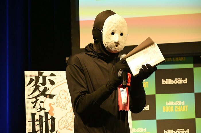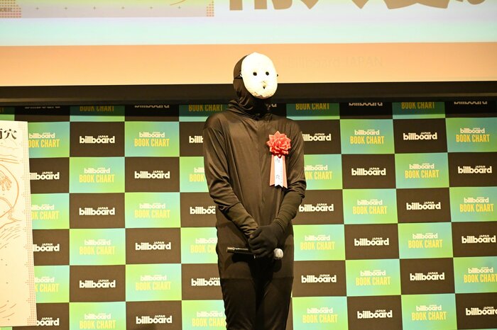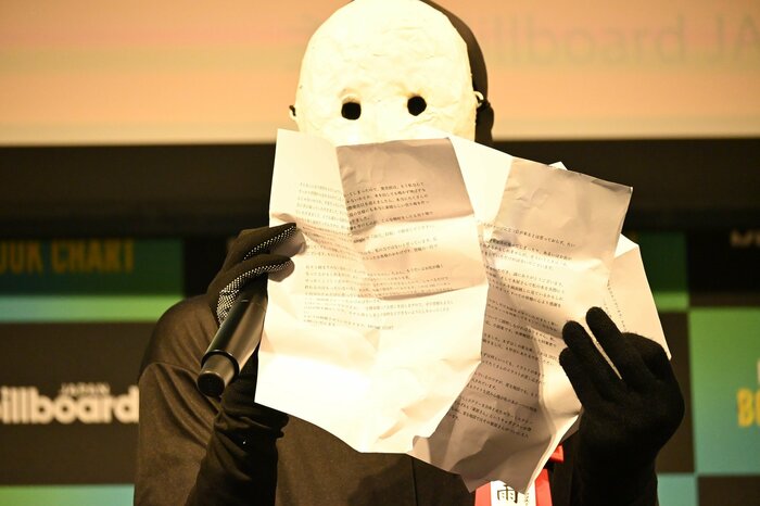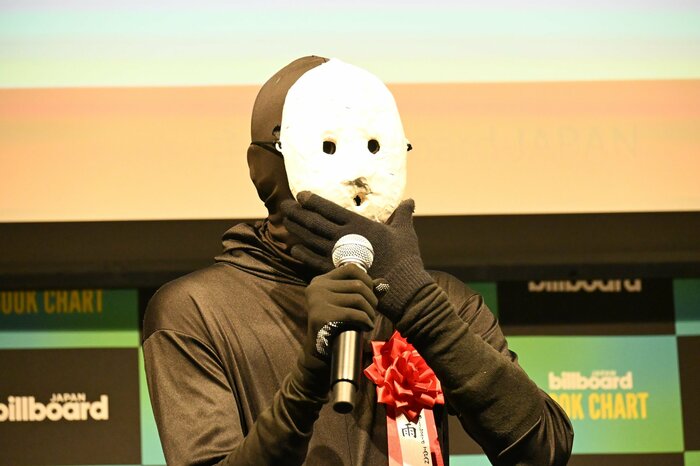 続けて「自分が1位になると思っておらず、すごく驚きましたし、あと、すごく運が良かったなと思ったのでとおります。本当にありがたいことです。ありがとうございます。少し罪深いことをしてしまったという気分はあるんですが、もし次に何かビルボードの賞がありましたら、次の作家さんにも何かお面をかぶっていただきたいです。ウルトラマンでもアラレちゃんでもいいんですけど、何でもかぶっていただいて、ビルボードの1位と言えばお面だよね、という変な伝統を作っていただけたらと思います。」と話し、笑いを誘いました。
