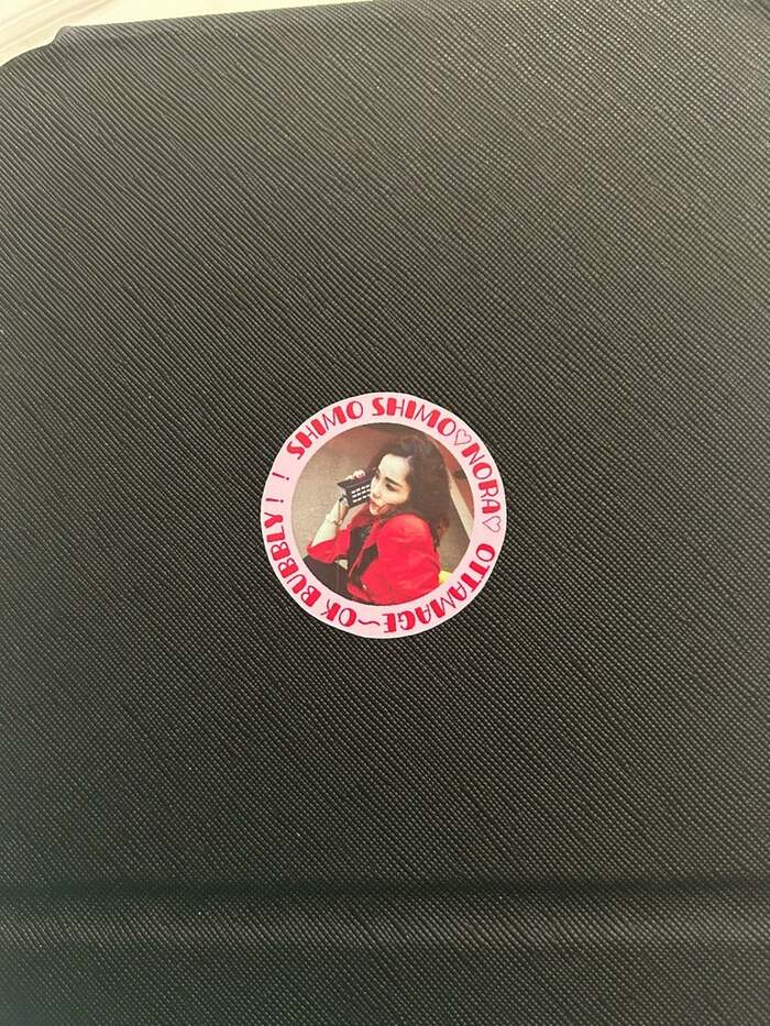 おなじみの“バブリースタイル”での丸形のステッカーを披露。ステッカーの縁には「SHIMO SHIMO NORA OTTAMAGE OK BUBBLY!!」と、かわいらしく文字がプリントされています。