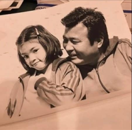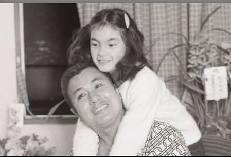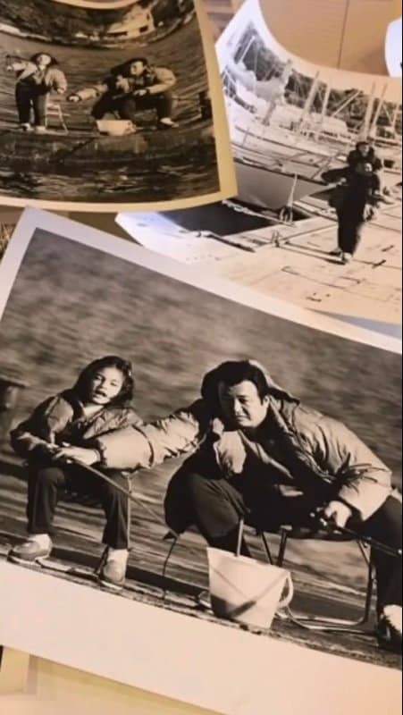 それは、まだ小さな頃のアンナさんが、釣りが大好きだった辰夫さんの横に座って竿を握っている写真。辰夫さんはアンナさんの竿に手を添え、真剣な表情で釣り方を教えているように見えます。魚がエサに食いついたのか、「わぁ~!」というように口を大きく開けたアンナさんの表情がかわいらしいですね。