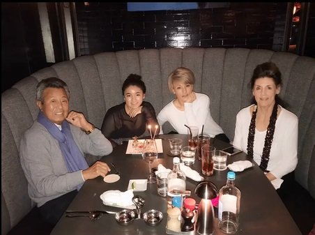 テーブルを囲んだレストランでの1枚で、4人とも顔をほころばせた温かい雰囲気が広がっています。辰夫さんは、グレーのニットにネイビーのスカーフを巻いた粋なスタイル。真っ白な歯が輝いています。