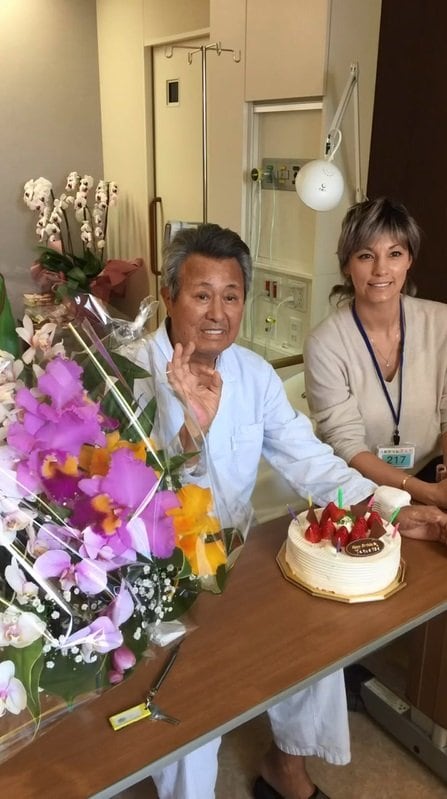 さらに、辰夫さんの入院中に撮影した父娘ショットでは、テーブル上に大きな花束と、誕生日ケーキの前で微笑む辰夫さんの姿が。娘の隣で柔らかな表情を浮かべ、OKサインを見せる辰夫さんが印象的です。