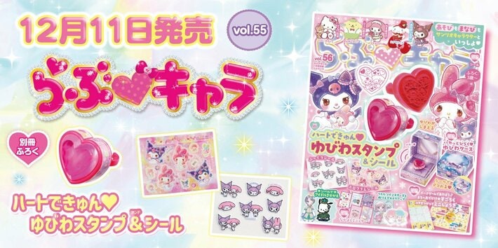 サンリオキャラクターズといっしょに遊んで学べる雑誌『らぶキャラ』。今号の付録はハートのジュエルがかわいい、マイメロディ&クロミのゆびわスタンプ。大流行中のシールはホログラム&ぷっくりシールの2種類!