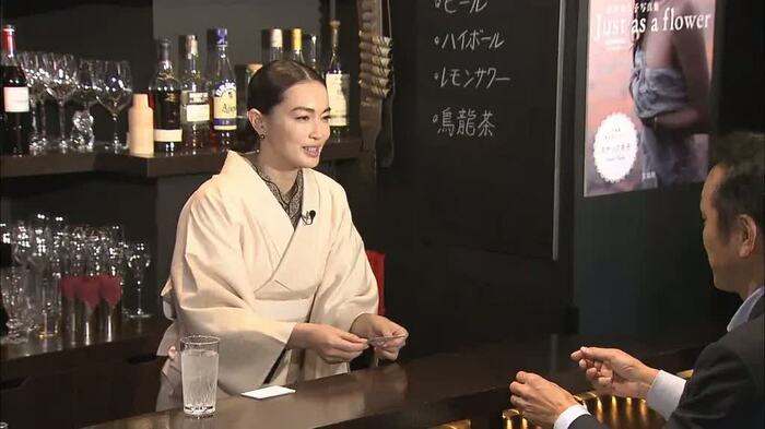 名刺を差し出し、着物姿でお客さまのおもてなしも。提供するお酒は、酒に強くないという京子ママらしく(?)レモンサワーのみ。「私は飲めないんですよ、あんまり。でも、ハイボールは比較的飲みます」と笑顔を見せた。