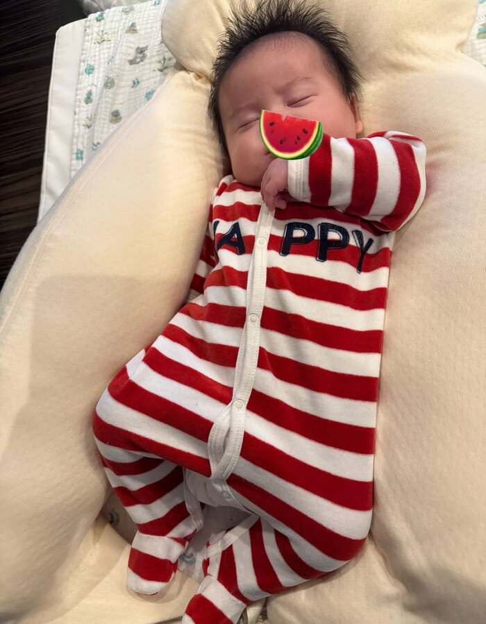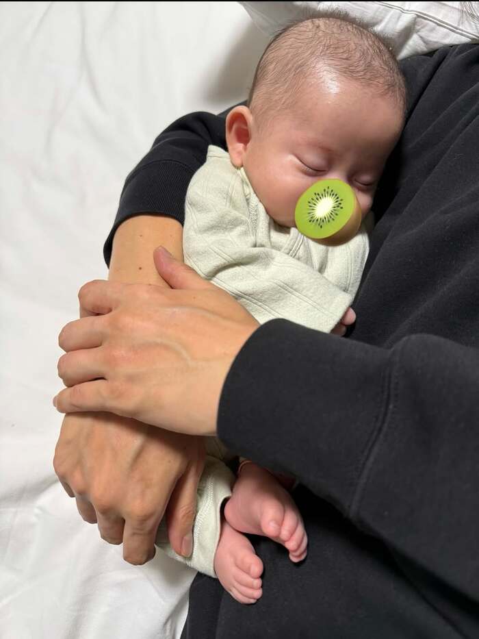 さらに「パパの腕で抱っこされてたら寝ちゃうキウイくん」とつづり、夫の腕の中にすっぽり収まって眠る弟くんのショットも披露!