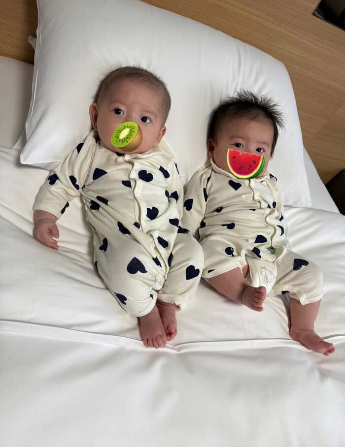 そんな、すくすく成長中な双子の子育てに奮闘中の中川さんは、今回の投稿で「双子 よく眠るようになってかわいいです お兄ちゃん6270g 弟くん5405g 育ってます」とつづり、おそろいのロンパースを着た双子のショットを公開。