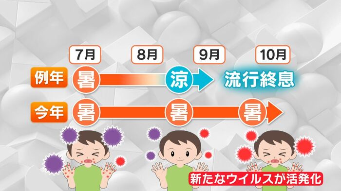 「『手足口病』は暑いところが好きなウイルスなので、一度夏に流行した型は終息に向かっていますが、今年はまだ暑い日が続いていることから2度目の流行に繋がっていると思われます。」