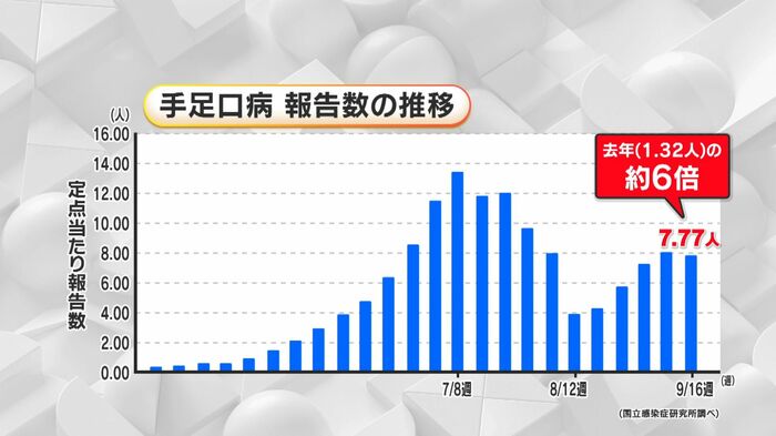 国立感染症研究所がまとめた「手足口病」の定点当たりの患者の報告数を見ますと、7月のピーク以降 減少傾向となったものの8月中旬ごろから再び増加。