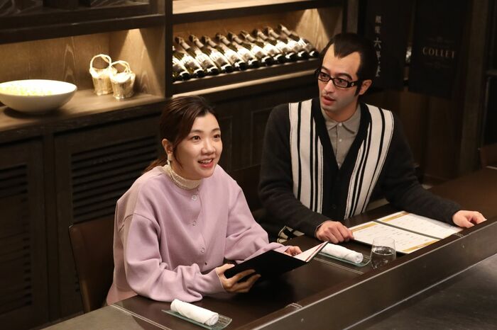鳥羽が働く韓国料理屋で食事する綾子とハートパイ。髪型やメガネ、服装をプロにコーディネートしてもらったハートパイは、お洒落な雰囲気になっていた。