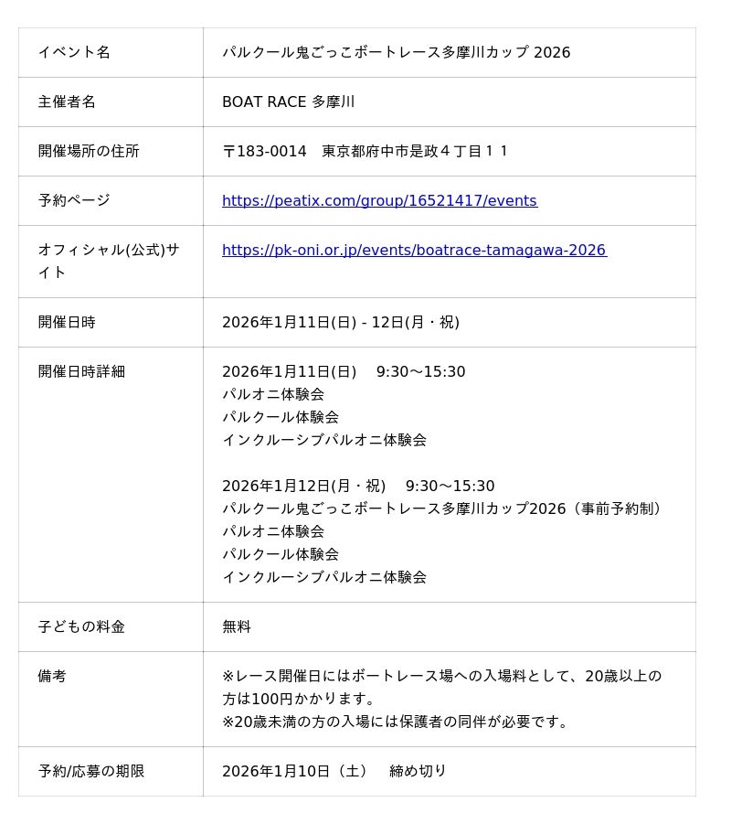 BOAT RACE 多摩川で開催される「パルクール鬼ごっこボートレース多摩川カップ2026 」では、「あそびがカラダを作る!」をテーマに、パルクール鬼ごっこで楽しさとともに能力を向上させる、小学生以下及びその保護者を対象とした限定のイベントを1月11日(日)・12日(月・祝)で2日間に渡り開催!