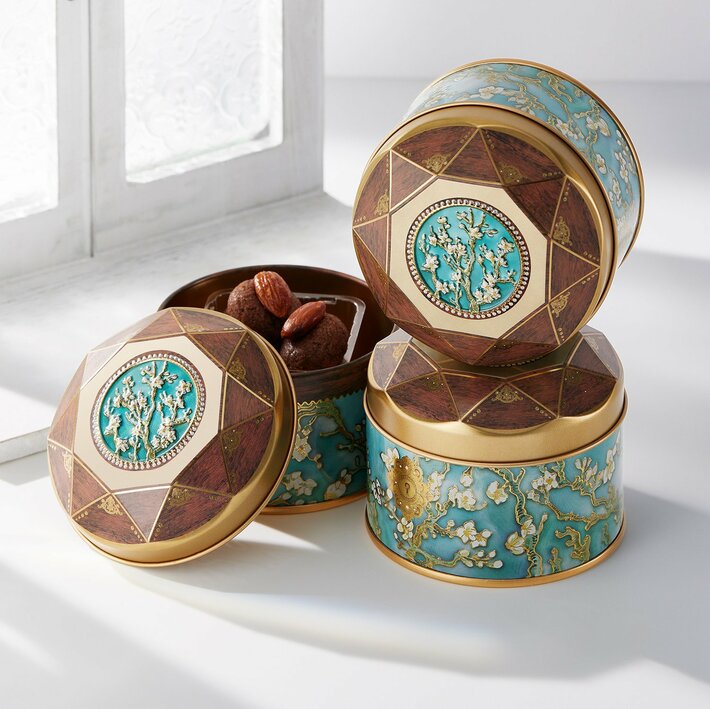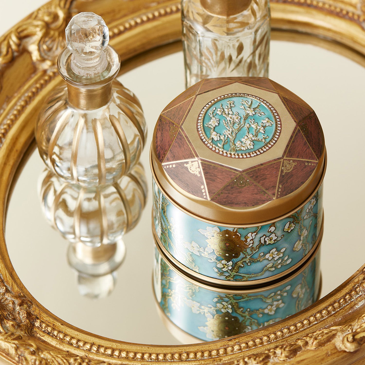 缶の側面には、『花咲くアーモンドの木の枝』をイメージして描いたガラス絵を一面にデザインしました。