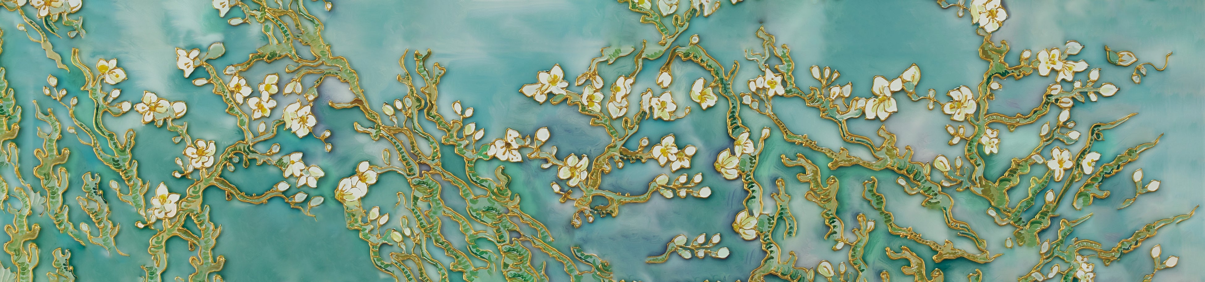 グラスペイントアーティストのAlisa Horitaが、『花咲くアーモンドの木の枝』からインスパイアされたガラス絵を描き下ろしました。原作の色合いを大切に、ガラス絵でその魅力を表現しています。