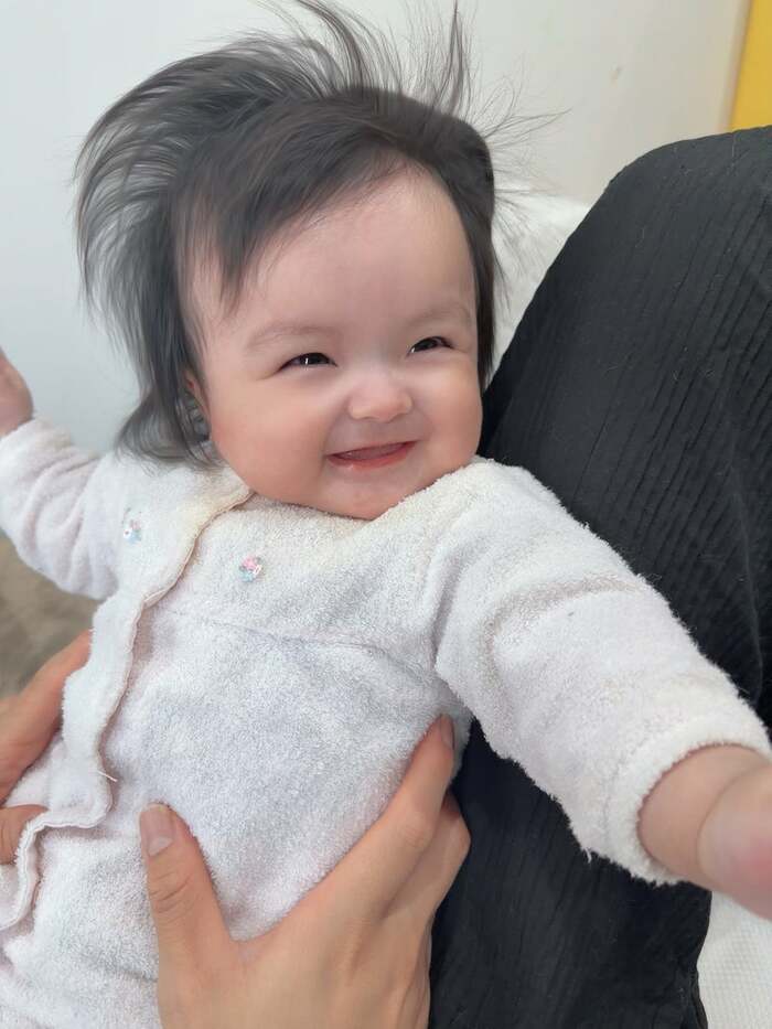 ふさふさの髪の毛を立たせながら、もちもちのほっぺたをニコッと上げています。両目を三日月のように細めた笑顔も、たまらなく愛らしいですね。