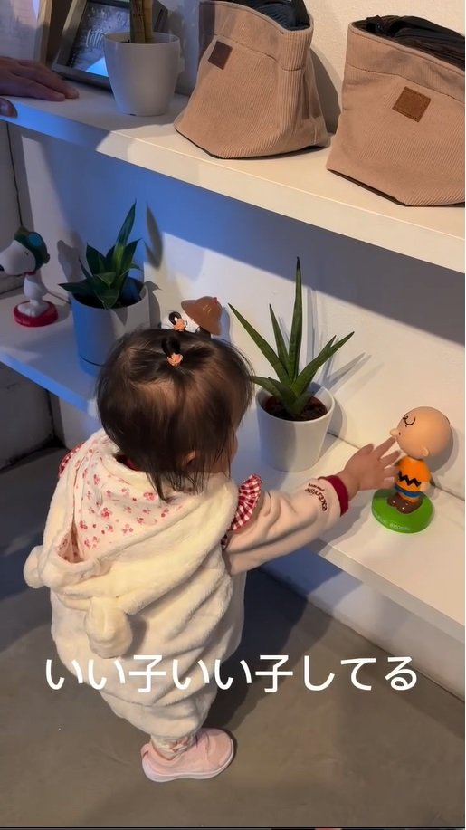 店内に置かれたスヌーピーなどの「PEANUTS」のキャラクターに手を添えたにこりちゃんは、“いい子いい子”と愛でる姿を見せます。なんともかわいらく、ギュッと抱きしめたくなりますね。