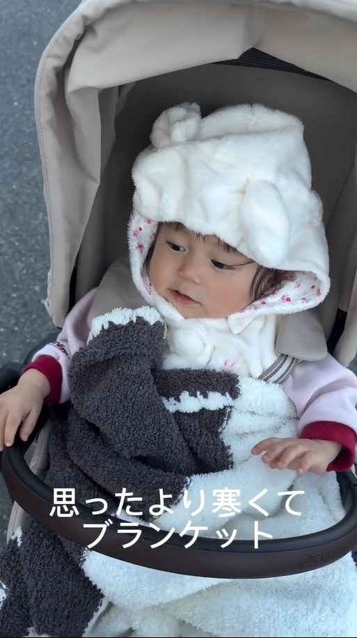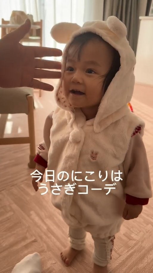 動画冒頭、「今日のにこりはうさぎコーデ」というテロップとともに、自宅のリビングにちょこんと立つ、にこりちゃんの姿がうつしだされます。大きなうさ耳がついた真っ白な“うさぎコーデ”に身を包んだにこりちゃんは、ウキウキな様子でニッコリ♪西野さんも「出産祝いでもらってやっと着れた♡」とつづり、うれしそうです。