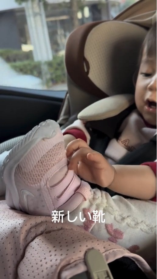 チャイルドシートに座ったにこりちゃんは、身に付けた新しい靴に興味津々。凝視しながらさわる姿に癒やされます。