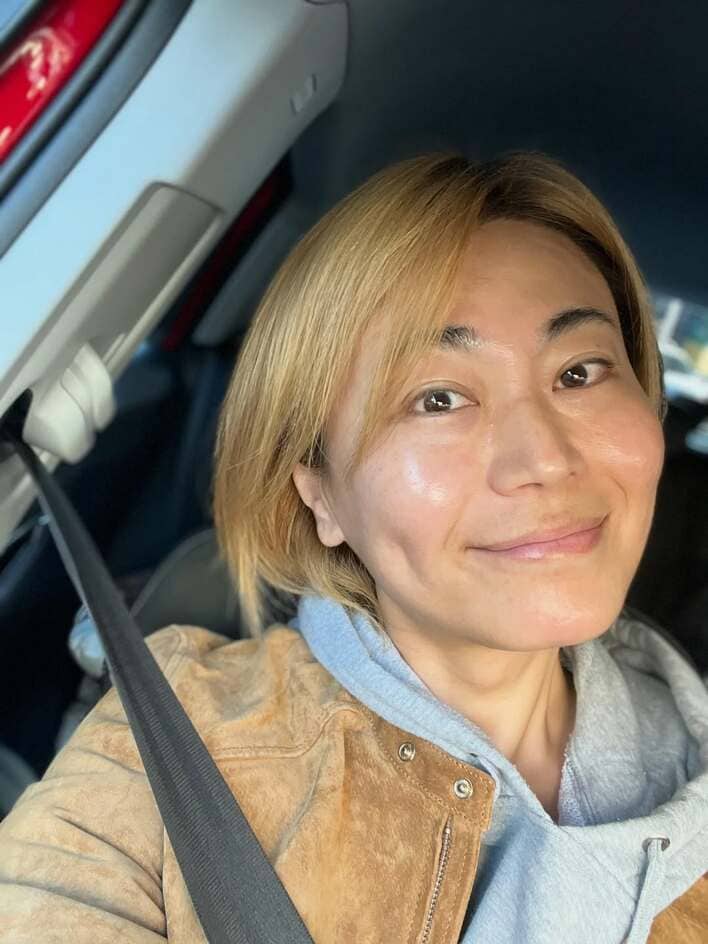 投稿したされた写真では、サラサラの金色ヘアに、ライトグレーのパーカーとベージュのジャケットを合わせたスタイルで、車内で穏やかな笑みを浮かべる自撮りショットを披露しました。