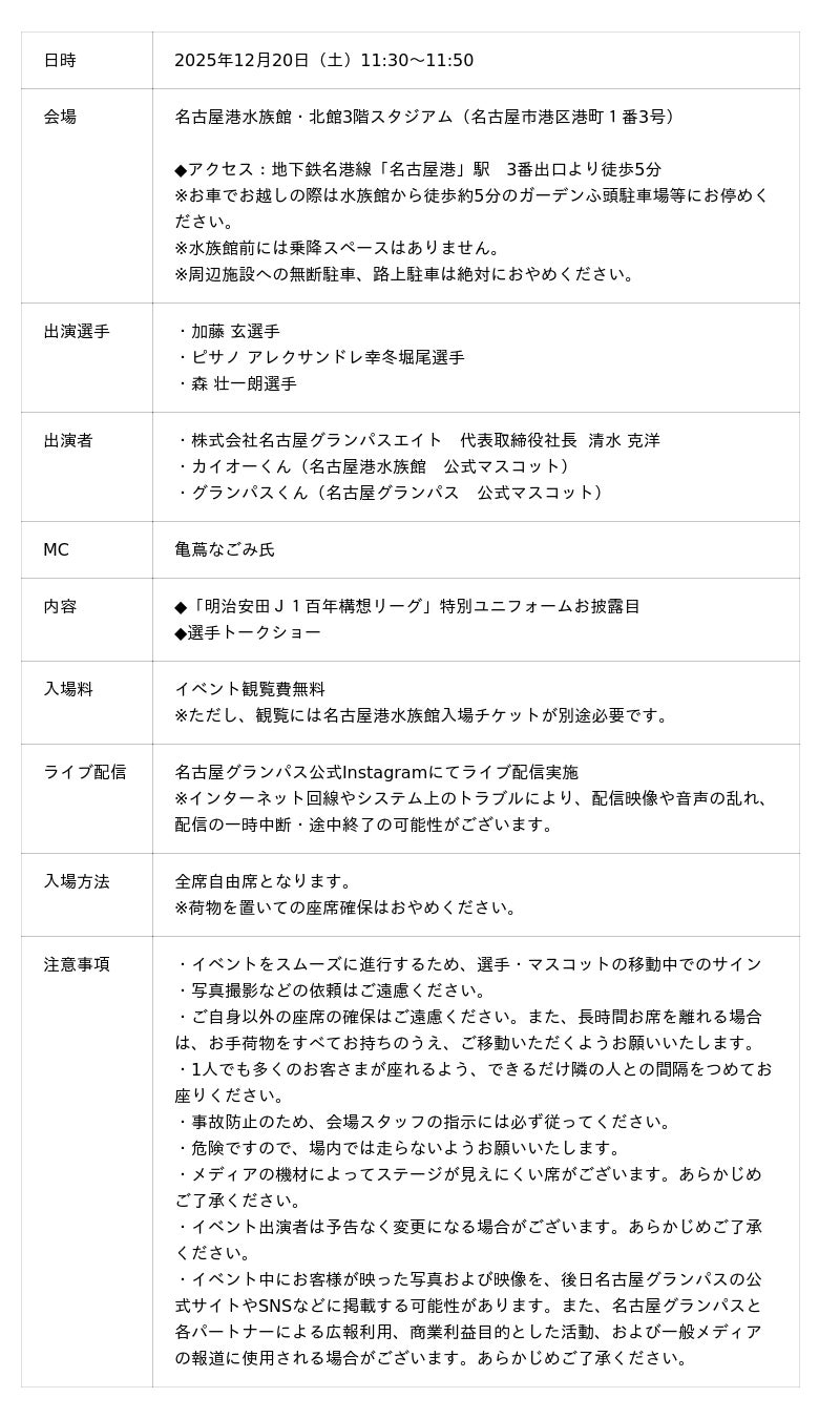 名古屋グランパスは、「明治安田J1百年構想リーグ」で着用する特別ユニフォームのデザイン発表を、2025年12月20日(土)名古屋港水族館にてコラボレーションイベントとして開催いたします。