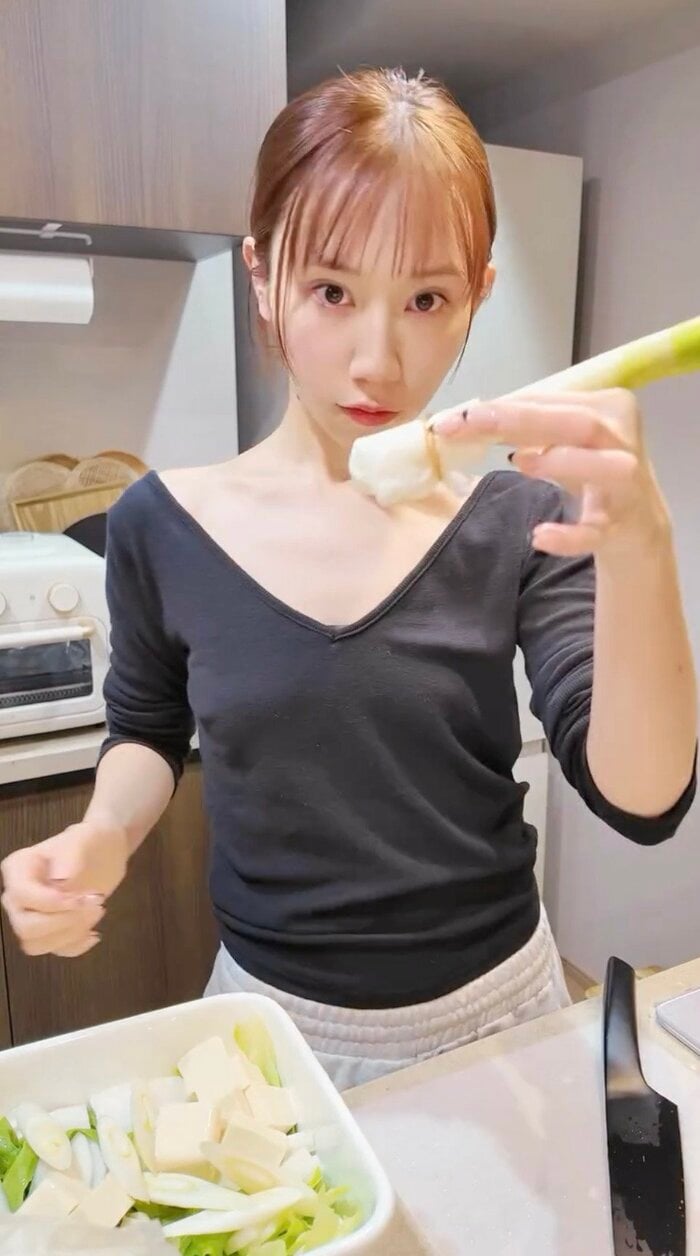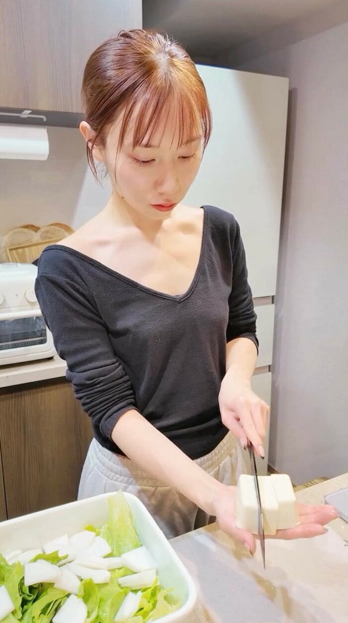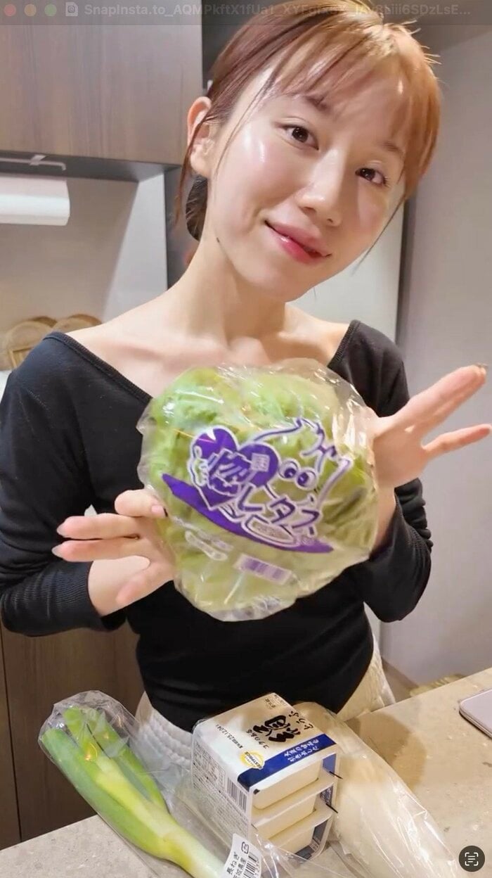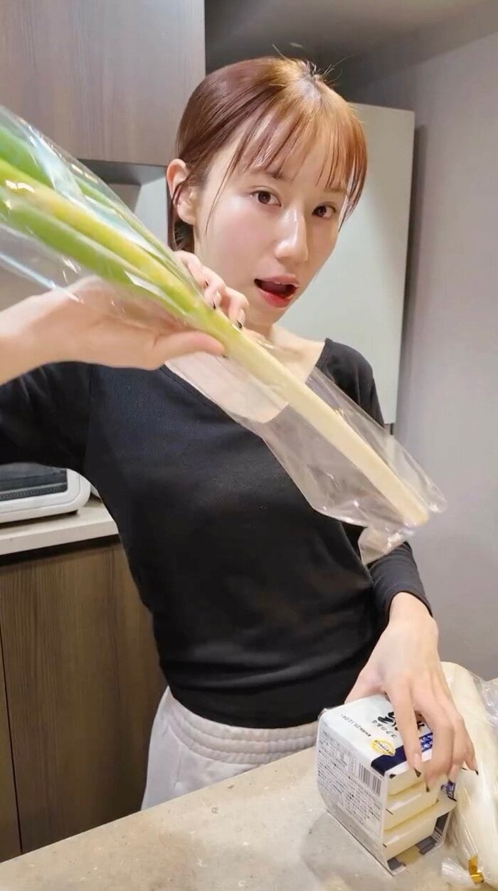 動画で髪を後ろでまとめてスッキリ料理モードのみゆさんはキッチンに立ち、買ってきた材料たちを紹介。カメラに向かってレタスや…