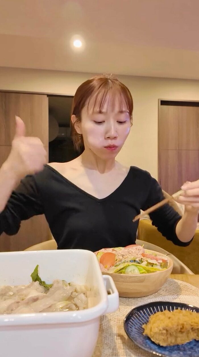 まずはサラダを一口食べ…、その出来栄えにグッドポーズをするみゆさん。