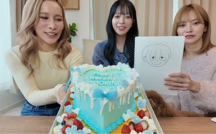 さらに、お祝いの大きなホールケーキが登場すると、「え、めっちゃ可愛い!」とテンションがあがるさおりんさん。「Happy Wedding SAOORIN」と描かれた水色をベースとしたケーキで、ふちには生クリームやバラの花、リボンなどが飾られています。ケーキの周りには、イチゴやブルーベリーなどのフルーツも添えられており、とても豪華で食べてしまうのがもったいないほど。