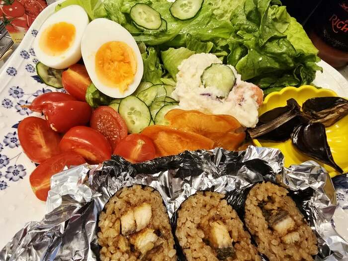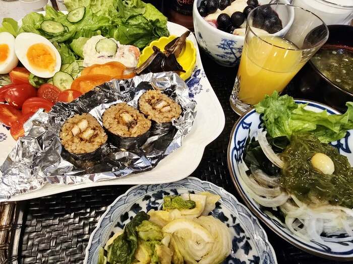 朝からひつまぶしが食卓に並ぶとは、なんとも豪華な食卓ですね。サラダの横には、味付けされたご飯で包まれた“鰻と玉子ののり巻き”が並んでいます!