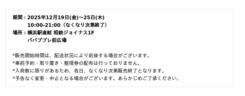 昨年の出店時には、連日多くのお客様に足を運んでいただき、夕方には完売が相次ぐなど大変ご好評をいただきました。こうした温かい声にお応えし、今年もクリスマスシーズンに合わせた出店が決定いたしました。