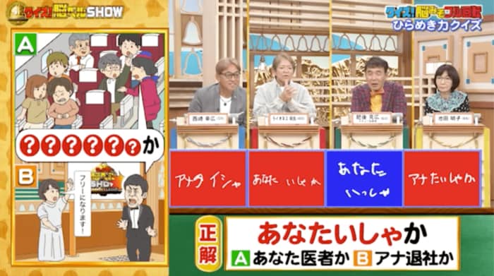 正解は「あなたいしゃか(あなた医者か/アナ退社か)」。