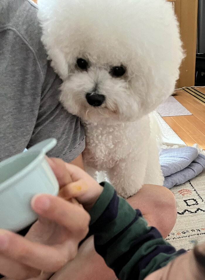 普段の様子を見てみると、飼い主のお子さんの食べ物をじーと見つめたり…。