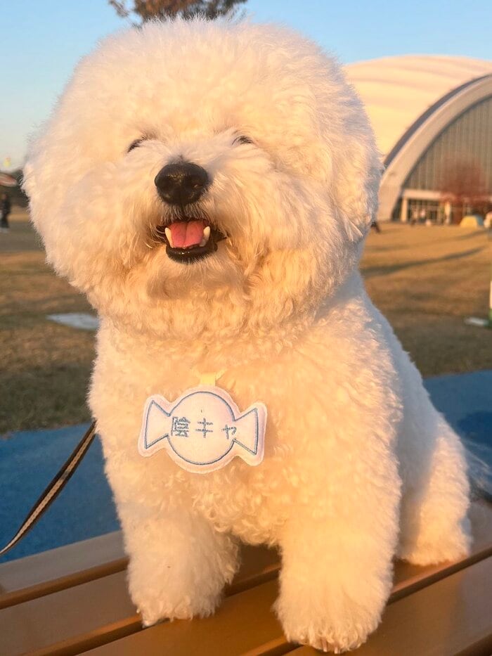 太陽の光を浴びながらニッコニコな表情を浮かべているのは、4歳のビションフリーゼ「せと」くん。飼い主さんによると「お散歩とごはんが好きで、性格はおとなしい方(陰キャ)」だといいます。