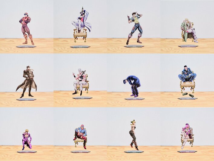 ジョナサン・ジョースター、ウィル・A・ツェペリ、ジョセフ・ジョースター、シーザー・A・ツェペリ、空条承太郎、ジャン・ピエール・ポルナレフ、東方仗助、虹村億泰、ジョルノ・ジョバァーナ、グイード・ミスタ、空条徐倫、ナルシソ・アナスイの全12人が、椅子に腰をかけたクールな姿で登場します。