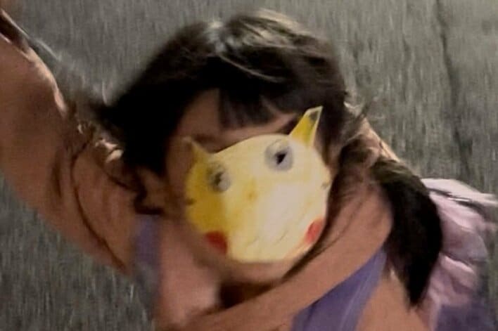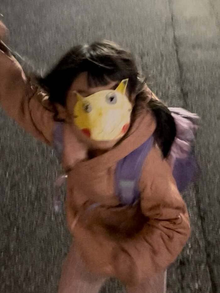 公開された写真を見てみると、手作りのピカチュウのお面をつけてこちらを見つめている長女の姿が!お面は、先が黒いとんがった耳や赤いほっぺなど、ピカチュウの特徴がしっかりと捉えられていてとても上手にできていますが、横澤さんは「夕方5時の帰り道はもう真っ暗で、開いてる穴から見える黒目がとても怖い。」と、お面をつけた長女の姿に若干の恐怖を感じているよう。