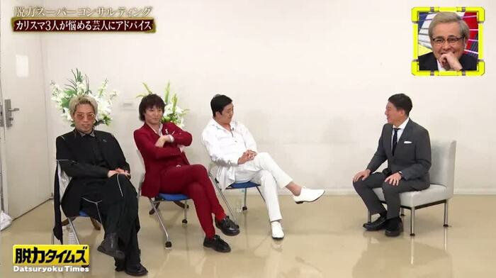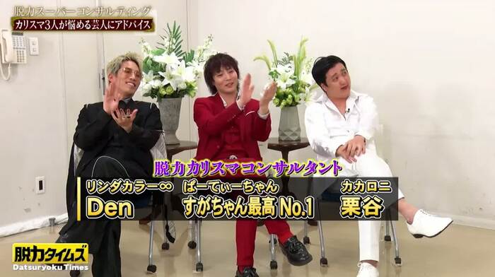 別室で待っていたのは、“脱力カリスマコンサルタント”の3人(Denさん/リンダカラー∞、すがちゃん最高No.1さん/ぱーてぃーちゃん、栗谷さん/カカロニ)。