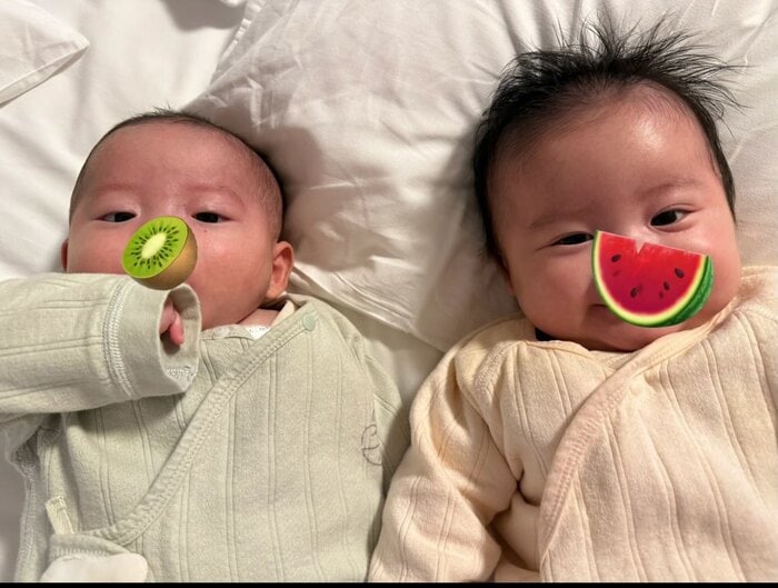 この日はの投稿では、色違いのベビー服を着て、身を寄せ合って寝転ぶ双子の姿や、
