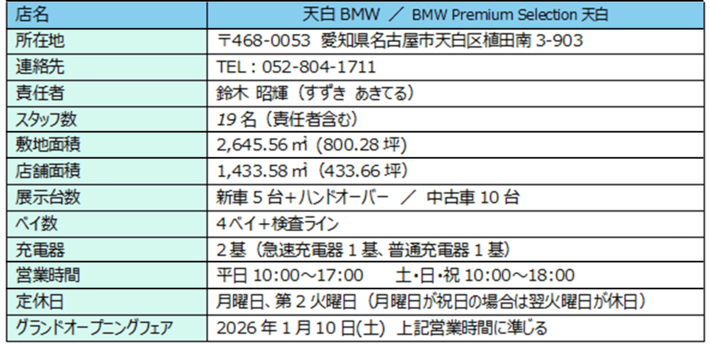 株式会社ヤナセ(社長:森田 考則)のグループ会社で、BMWを専門に取り扱う、ヤナセ バイエルン モーターズ株式会社(社長:落合 貴 本社:東京都港区)は「天白BMW/BMW Premium Selection天白」をリニューアルし、12月17日(水)に営業を開始します。