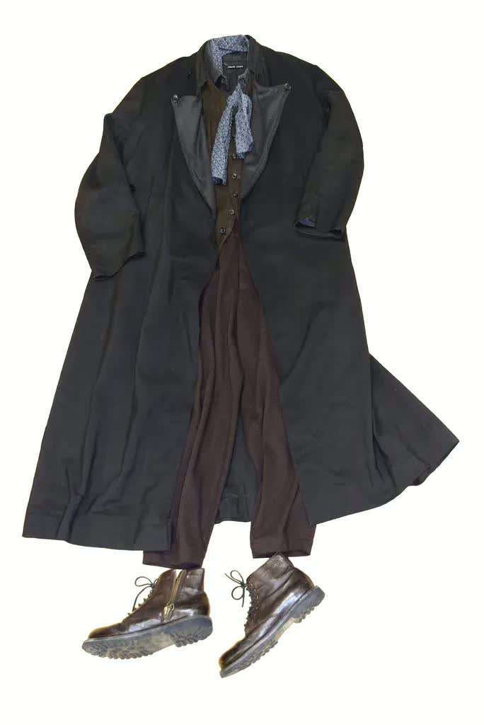 今回は、スタイリストチームを組んで渡辺慎也くんにも加わってもらい、印象的なロングコートを探し回り、その中から一番“キワモノ感”のあった、古着の黒いコートに決まりました。