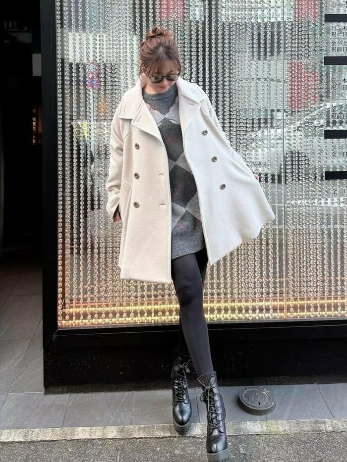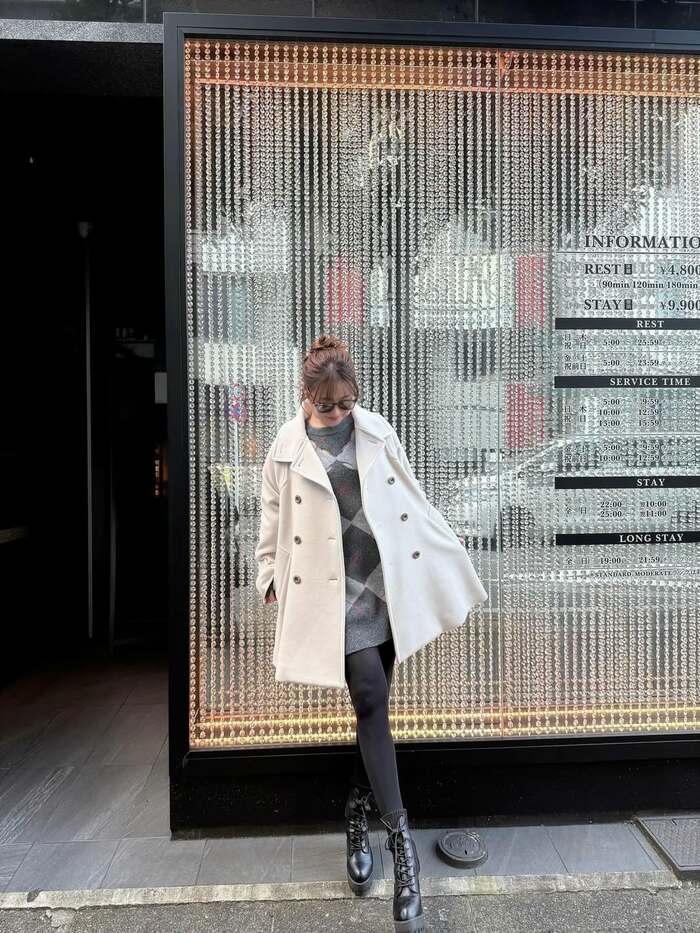 「ラブホ女子会しました!」と、番組の企画でホテルに訪れたことを報告した鈴木さんは今回、ホテル前でたたずむショットを公開。白いミドル丈のコートを羽織り、インナーにはアーガイル柄の膝上ミニ丈のニットワンピースを着て、黒いタイツに黒いブーツを合わせた冬のコーディネートを披露しています。