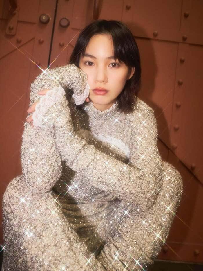 膝を立てて座り、頰づえをついたような姿のショットも披露。体そのものが発光しているようなインパクト大な豪華衣装を堂々と着こなす姿からは、抜群の存在感が伝わってきますね。
