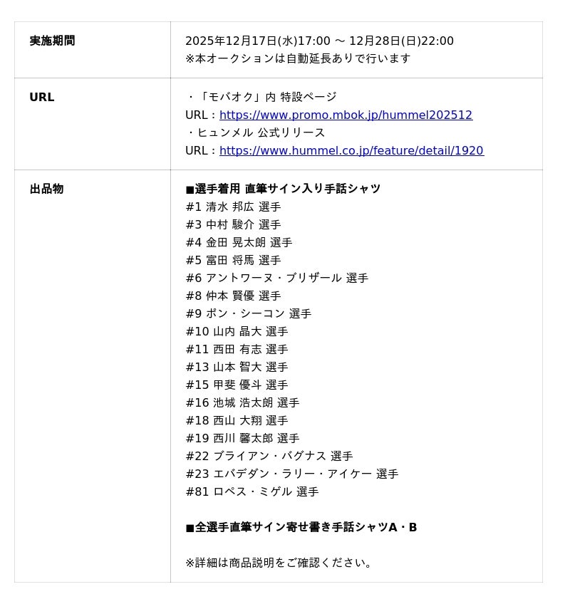 株式会社モバオク(本社:東京都渋谷区、代表取締役社長:小一原 宏樹、以下モバオク)が運営するオークションサービス「モバオク」にて、株式会社エスエスケイが実施する「大阪ブルテオン×ヒュンメル 手話シャツ チャリティーオークション」を、2025年12月17日(水)から開始いたします。