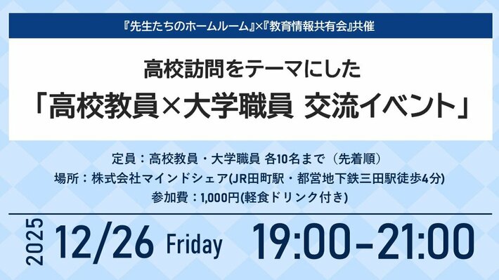 今回は多種多様な教育者が在籍するコミュニティを運営する『先生たちのホームルーム』と共催で高校教員と大学職員が一堂に会し、「高校訪問」をテーマに意見交換・交流を行うイベントを開催いたします。