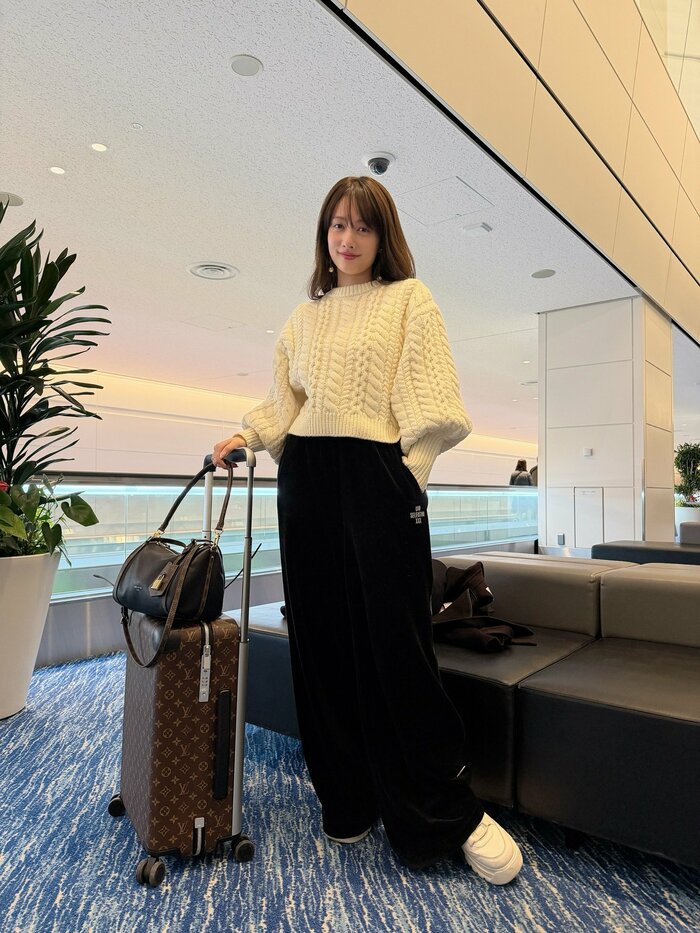 そこには、ボリューム感のある袖の白ニットに黒のパンツを合わせた、ラフなスタイルを着こなす谷さんの姿が。ポケットに手を入れて、おしゃれなスーツケースとともにポーズをきめています。