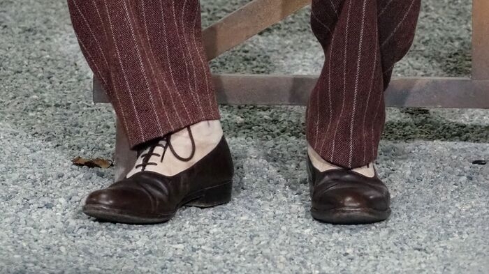 鈴鹿さんは「僕の体を採寸して作っていただいたスーツで、シャツの襟の形とかも現代とは違うデザインで、靴も特注。細かいところへのこだわりがあって、カフスも可愛いです」と衣装を披露。