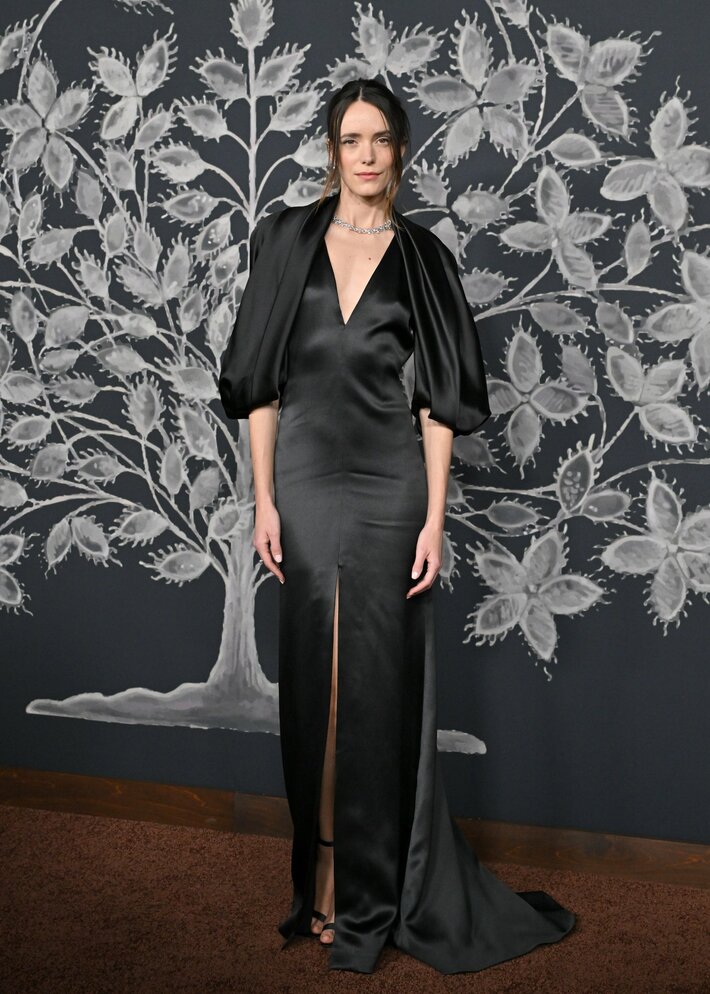 ステイシー・マーティンは、深いVネックの襟とドレープを効かせたスリークォータースリーブの、ブラックのシルクダブルサテン バイアスマーメイドドレスに、ブラックのサテンサンダルを合わせました。