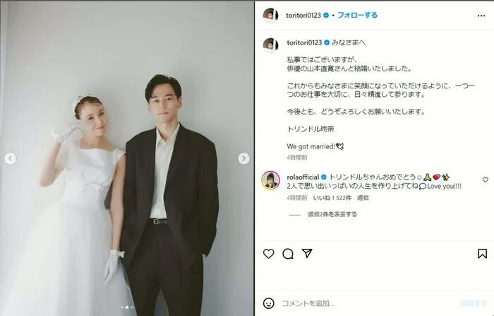 この投稿に、トリンドルさんとプライベートでも親交のあるローラさんが、「トリンドルちゃんおめでとう。2人で思い出いっぱいの人生を作り上げてね。Love you!!!!」と返信するなど、多くの祝福のメッセージが贈られました。