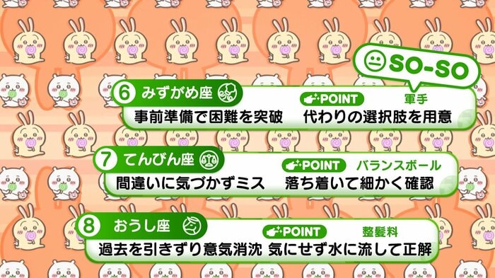 『めざましテレビ』で放送中の「ちいかわ占い」 テレビ放送がない日はお休みで、月~土:朝7時以降に更新予定です。